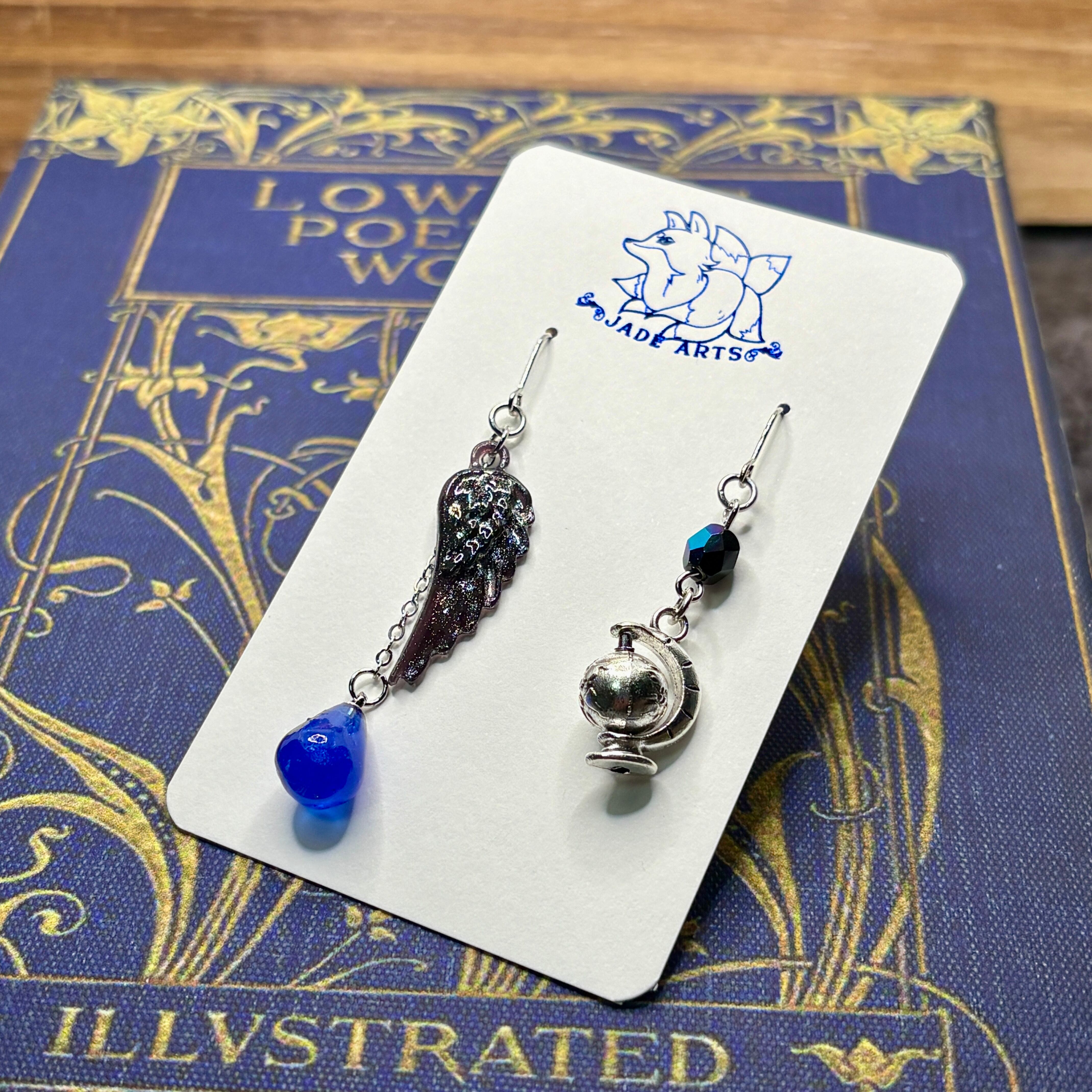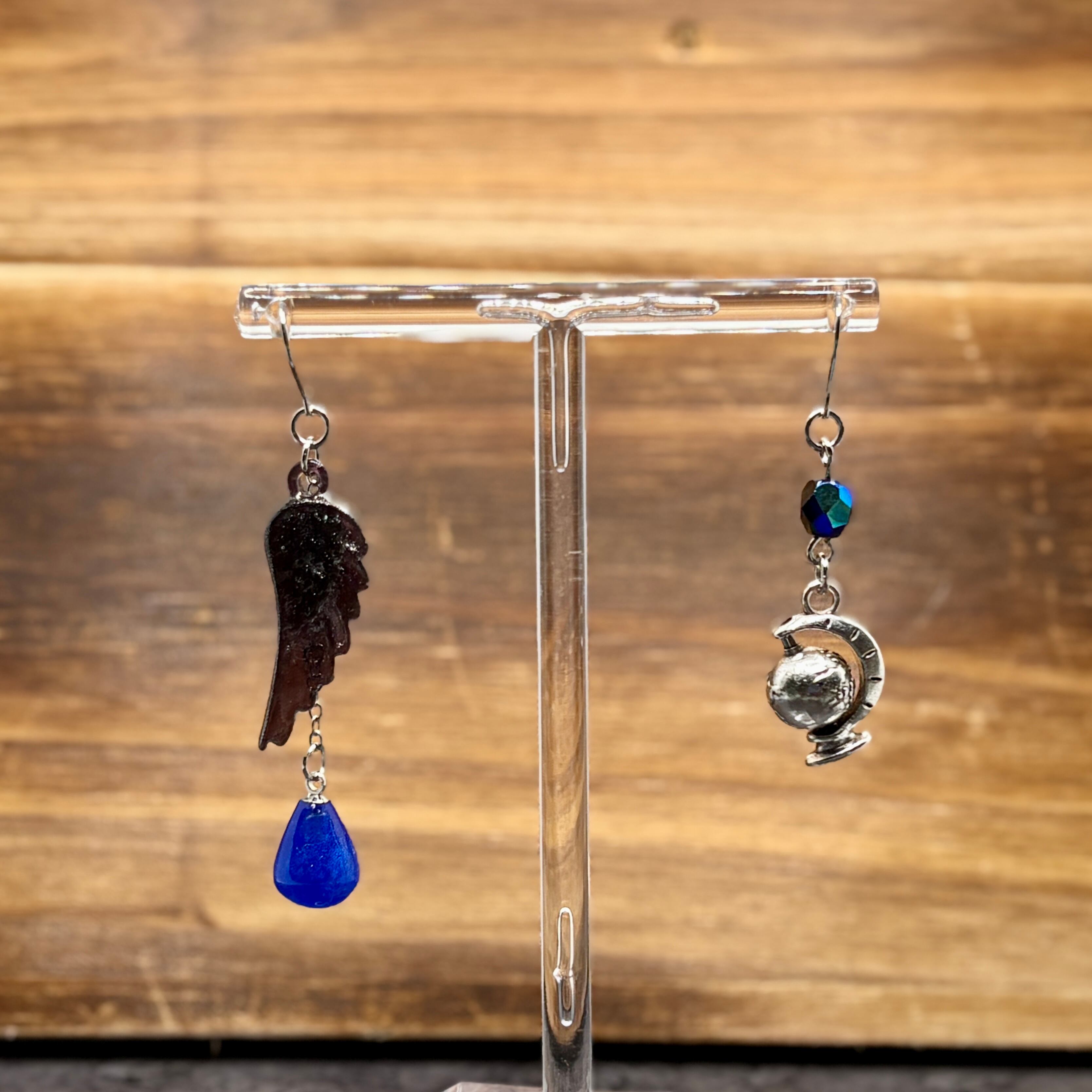 知性を感じさせる青と、その店の主人がつけていたとされる黒い羽飾りのピアス。